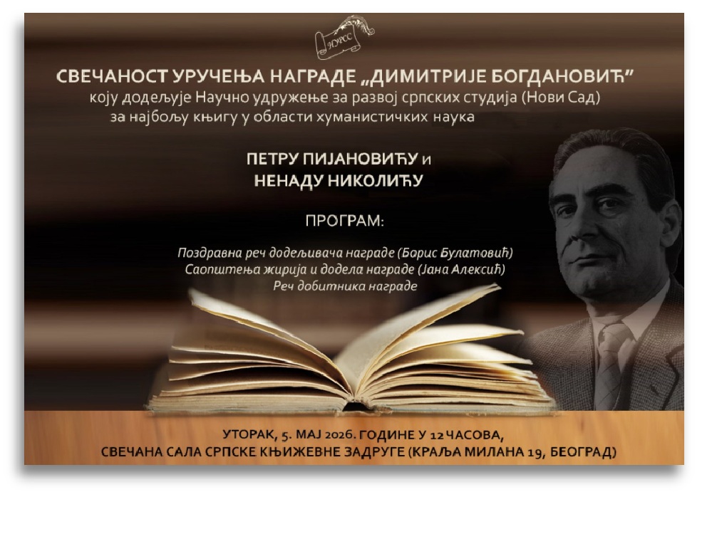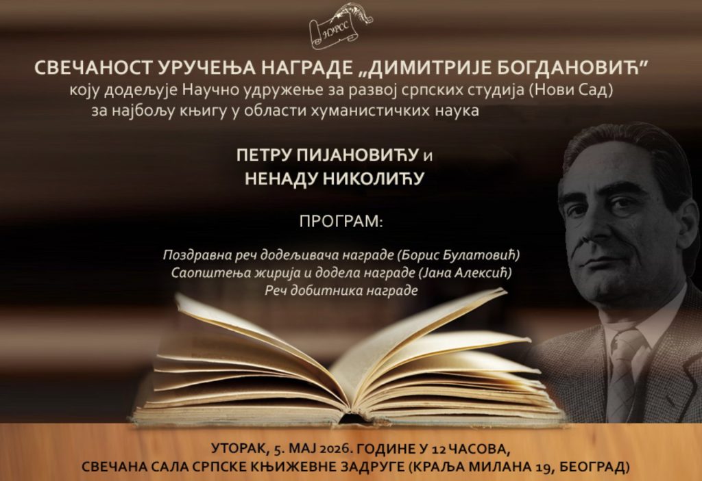 У уторак, 5. маја 2026. године, у Сали Српске књижевне задруге (Краља Милана 19, Београд) одржаће се свечаност уручења Награде „Димитрије Богдановић“,