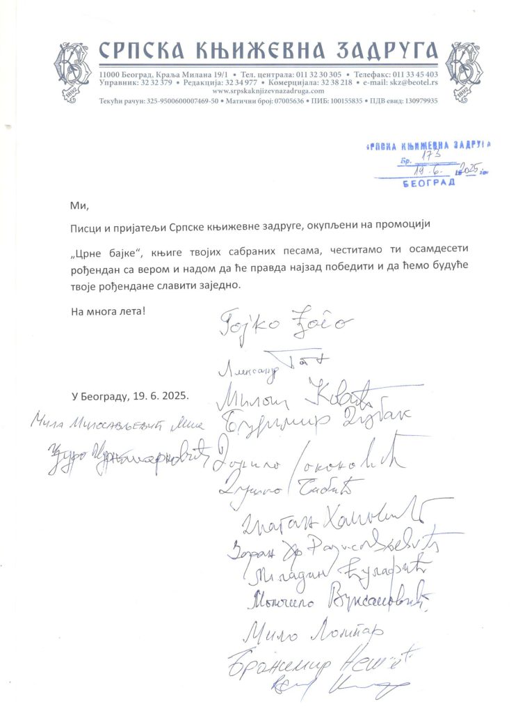 У четвртак, 19. јуна 2025. године, у Сали Српске књижевне задруге представљена је књига Радована Караџића ‒ „ЦРНА БАЈКА: сабране песме“, коју су ове године заједнички објавили Српска књижевна задруга,